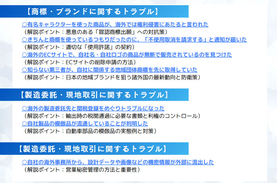 | 対象 | ●海外展開を検討中、または開始して間もない中小企業の経営者・経営幹部・海外展開担当者 ●海外企業と取引を行っている中小企業の経営者・経営幹部・海外展開担当者 ※対象者優先のため、対象外の方、士業・コンサルタントなど 当館が経営の専門家と認める方のご参加は、申込状況により受講をお断りする場合がございます。 |