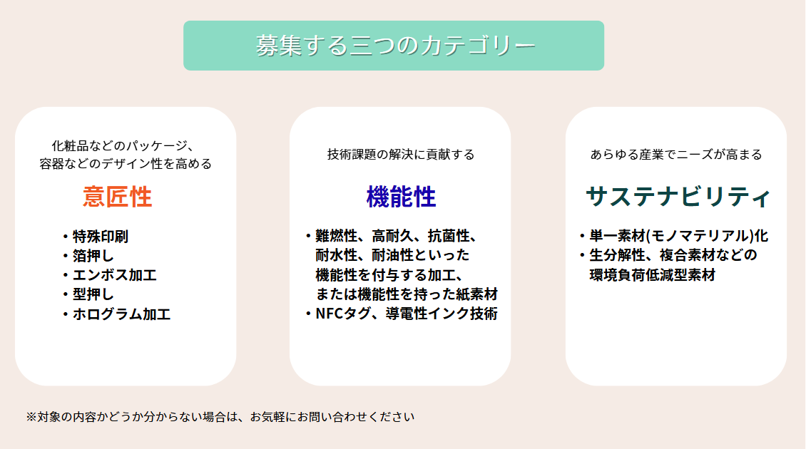 | 対象 | ●紙加工技術や、機能性紙製品など関連製品を持つ企業 |